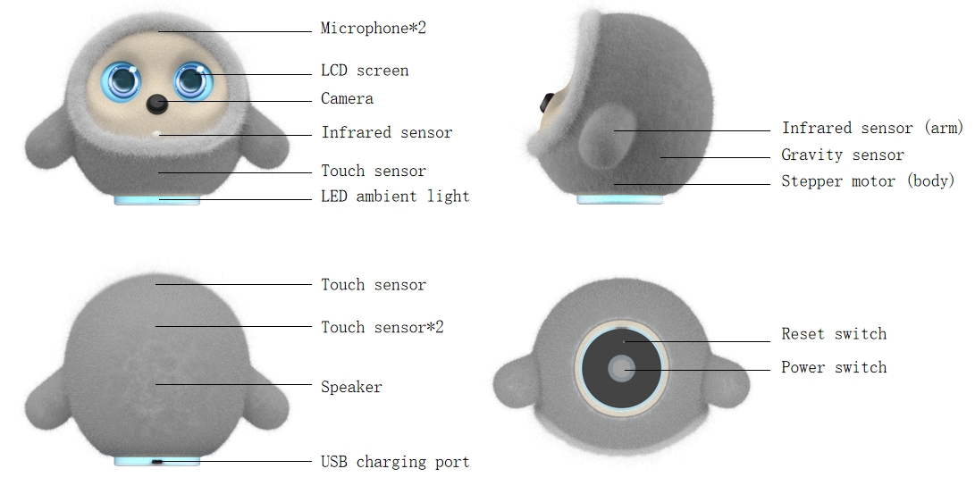 | Mikrofonoa | Robot maskota politak bere nortasuna eta emozioak ditu, ume batek bezala, erabiltzaileei eskaintzen diena epela laguntasuna eta balio emozionala. |