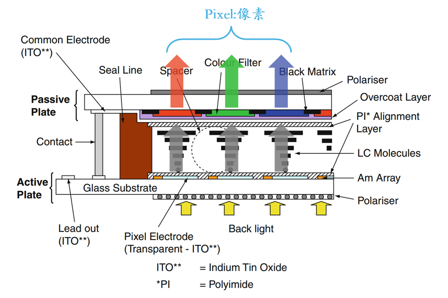 LCD (Liquid Crystal Display), pantaila-soluziorik helduena eta zabalduena den heinean, oinarrizko printzipio honetan funtzionatzen du: atzeko argi-unitate batek argi zuria igortzen du, polarizatzaileetatik eta kristal likido-geruza batetik igarotzen dena, RGB kolore-iragazkietara iritsi aurretik, hiru kolore primarioak sortzeko. Azkenik, pixel bakoitzaren distira doitzen da kristal likidoen molekulen orientazioa aplikatutako tentsioaren bidez kontrolatuz. Prozesu hau oinarrizko osagai batzuen lan koordinatuan oinarritzen da: atzeko argi-unitatea, TFT array, kristal likido geruza eta kolore-iragazkiak.