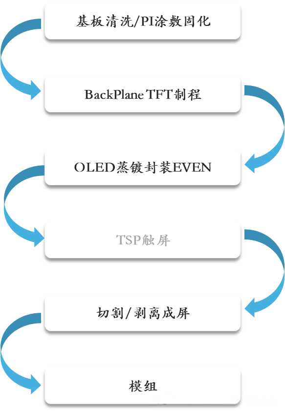 AMOLEDen oinarrizko fabrikazio-prozesuak hainbat unitate-prozesu oso teknikoak hartzen ditu barne. Backplane TFT (BP) prozesuan, Tenperatura Baxuko Silizio Polikristalinoa (LTPS) teknologia nagusi bihurtu da elektroien mugikortasun handia dela eta. Bere goiko atearen egitura-prozesuak, besteak beste, buffer-geruzaren deposizioa, kanal ioien inplantazioa, laser bidezko annealing kristalizazioa (ELA), ate metalezko sputtering eta iturburu-draina inplantatzea bezalako urratsak hartzen ditu. Gas bereziek rol kritikoa dute film meheen deposizioan, aldaketan eta akuafortean: adibidez, PECVD prozesuek SiH₄/N₂O/NH₃ erabiltzen dute a-Si/SiNx/SiOx film meheak metatzeko; Atomic Layer Deposition (ALD) TMA eta H₂O erabiltzen ditu Al₂O3 kapsulazio-geruzak osatzeko; lehorreko grabaketak zehaztasun handiko ereduak lortzen ditu CF4/SF6/Cl2 bezalako gasen bidez, non BCl3 erabiltzen den oxido metalikoaren geruzak murrizteko, eta Cl2-k grabaketa-produktu lurrunkorrak sortzen ditu, prozesu garbi eta eraginkorra bermatuz.